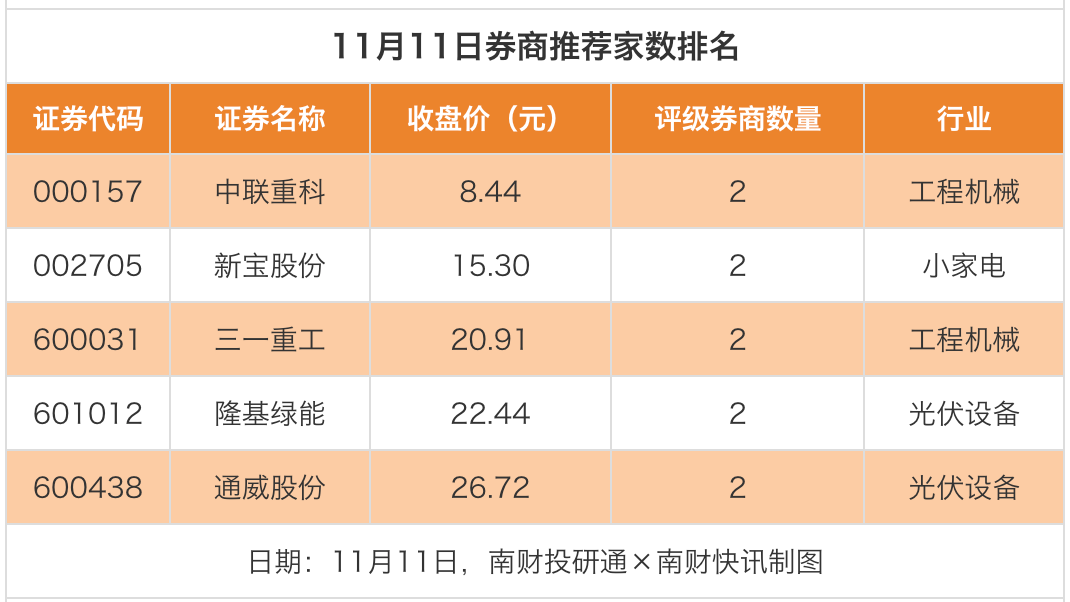 从券商推荐家数来看,11月11日有99家上市公司得到券商推荐。其中,中联重科、新宝股份、三一重工、隆基绿能、通威股份等获得2家券商推荐。