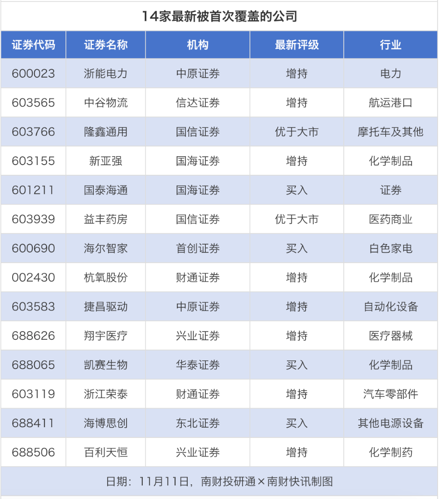 首次覆盖方面,11月11日券商共给出了14次首次覆盖,其中浙能电力获得中原证券给予“增持”评级,中谷物流获得信达证券给予“增持”评级,隆鑫通用获得国信证券给予“优于大市”评级,新亚强、国泰海通获得国海证券分别给予“增持”“买入”评级。