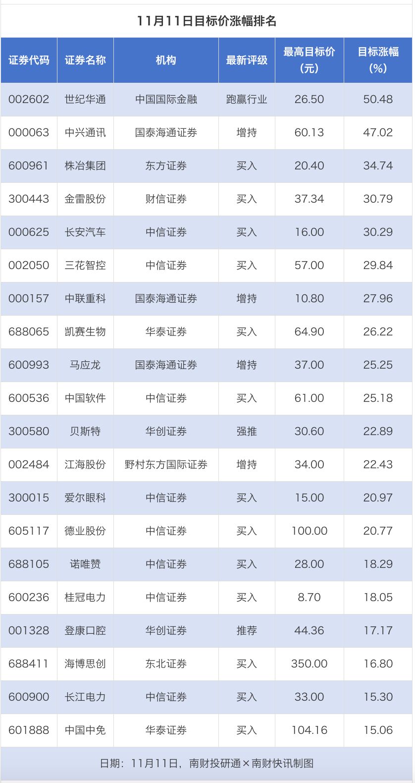 南财投研通数据显示,11月11日,券商给予上市公司目标价共21次,按最新收盘价计算,目标价涨幅排名居前的公司有世纪华通、中兴通讯、株冶集团,目标价涨幅分别为50.48%、47.02%、34.74%,分别属于游戏、通信设备、工业金属行业。