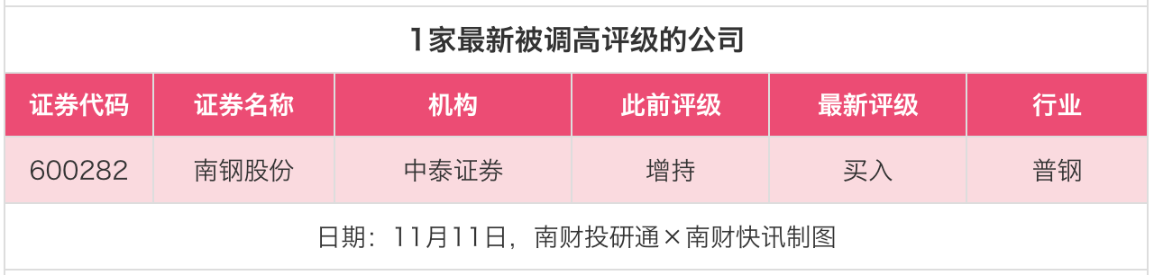 评级调高方面,11月11日,中泰证券对南钢股份的评级从“增持”调高至“买入”。