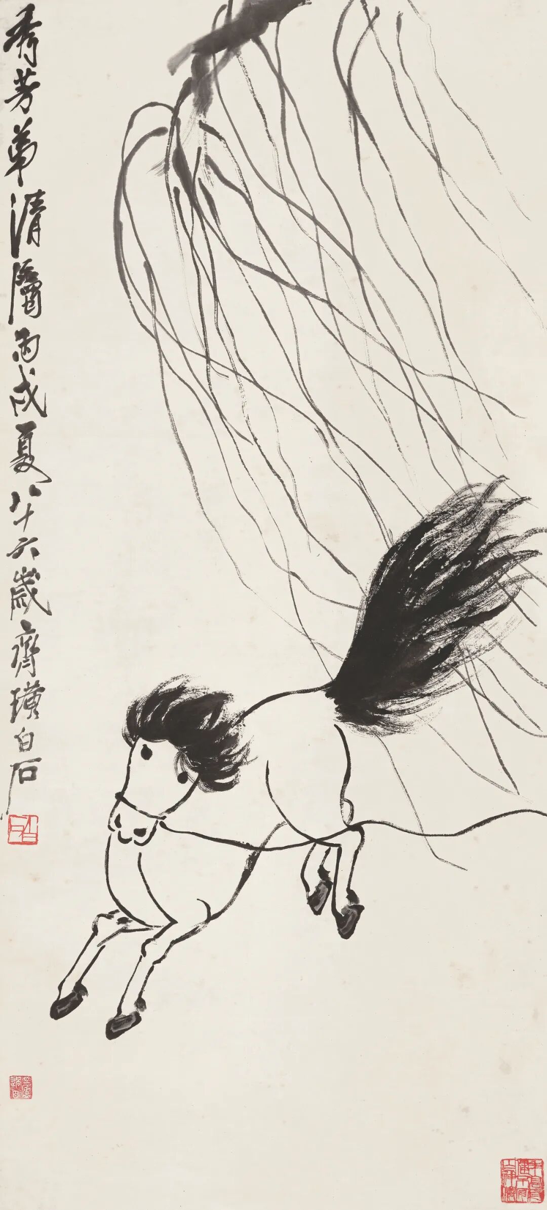 齐白石还有另一幅画马名作《春柳奔马》,这幅画创作于1946年,是齐白石赠予东北抗日名将马占山(字秀芳)(1887—1950年)的礼物,题识“秀芳弟清属,丙戌夏八十六岁齐璜白石”,钤印“白石”“年高身健不肯作神仙”。当时正值马占山调任东北保安副司令长官之际,齐白石赠送此画,既以“马”隐喻受赠者姓氏,又象征骁勇与胜利,意指画中的“千里马”即抗日名将马占山。