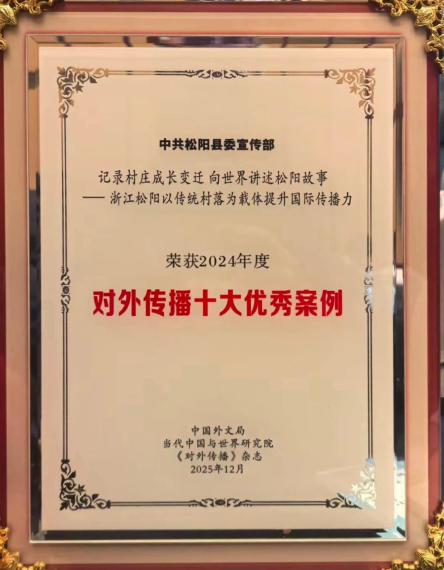 12月16日,由中国外文局、浙江省委宣传部主办的2025年国际传播协同协作工作会议在宁波召开。会上,《记录村庄成长变迁 向世界讲述松阳故事—松阳以传统村落为载体提升国际传播力》荣获“2024年度对外传播十大优秀案例”。